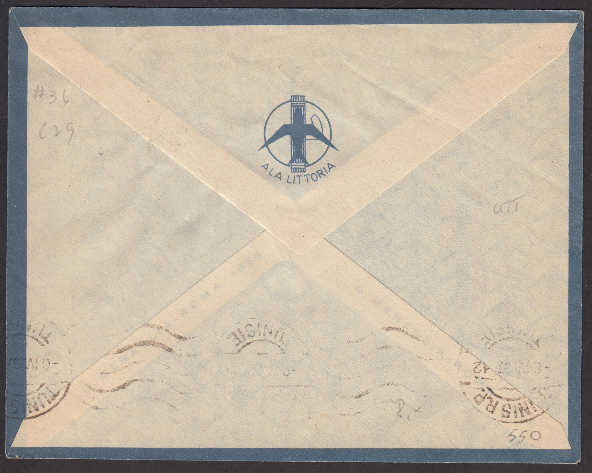 1937 - Primo volo Tripoli - Tunisi 6/4/37 affrancata con Posta Aerea Libia L. 1 bruno nero
