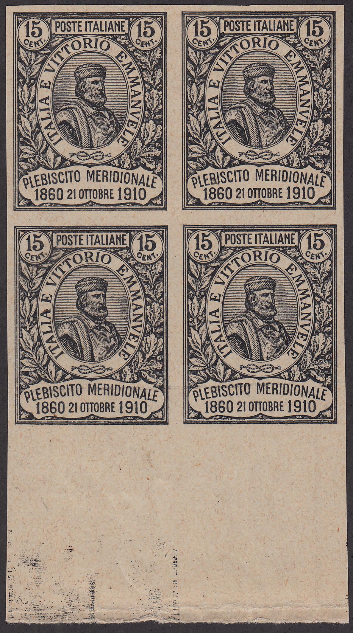1910 - Plebiscito nell'Italia Meridionale, Garibaldi c. 15 + 15 prova di stampa in nero su carta grigia, blocco di 4 esemplari non dentellati su carta grigia, bordo di foglio inferiore.