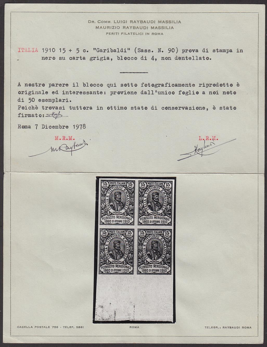 PP797 - 1910 - Plebiscito nell'Italia Meridionale, Garibaldi c. 15 + 15 prova di stampa in nero su carta grigia, blocco di 4 (P90)