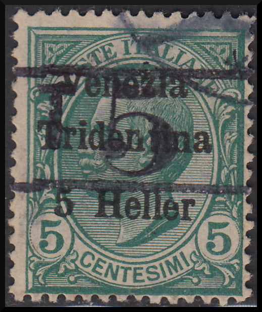 1918/19 - Trentino Alto Adige, ufficio di Bolzano 3, Leoni 5c. verde sopastampato "T 5" tra due righe orizzontali usato