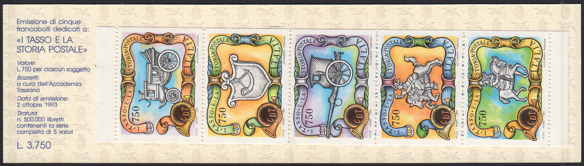 1993 - I Tasso e la Storia Postale, libretto contenente 5 esemplari da L. 750 nuovo perfetto