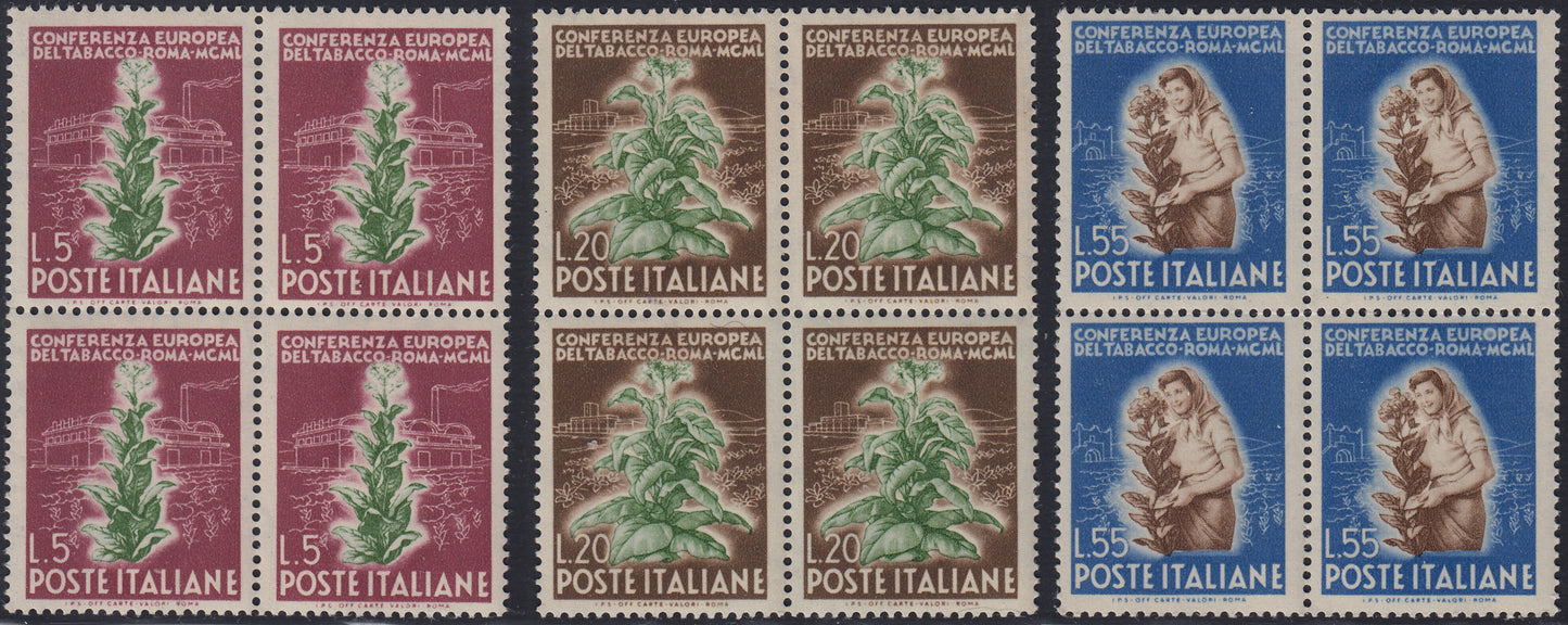 Rep65 - 1950 - Filigrana ruota alata - Conferenza Europea del Tabacco in quartina nuovi con gomma integra (629/631)