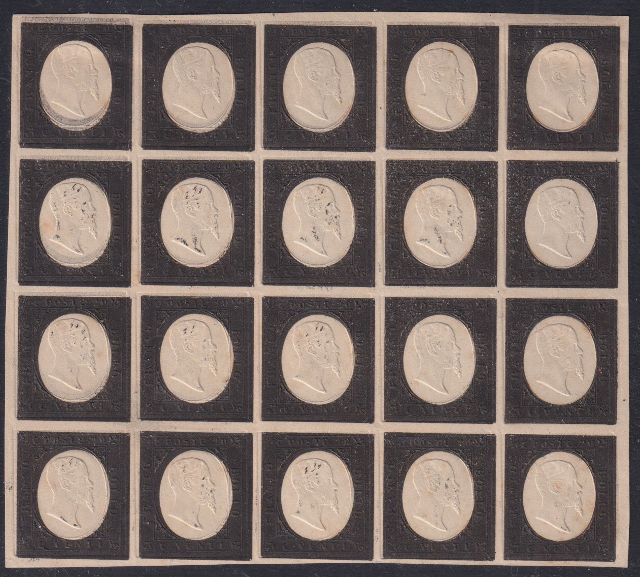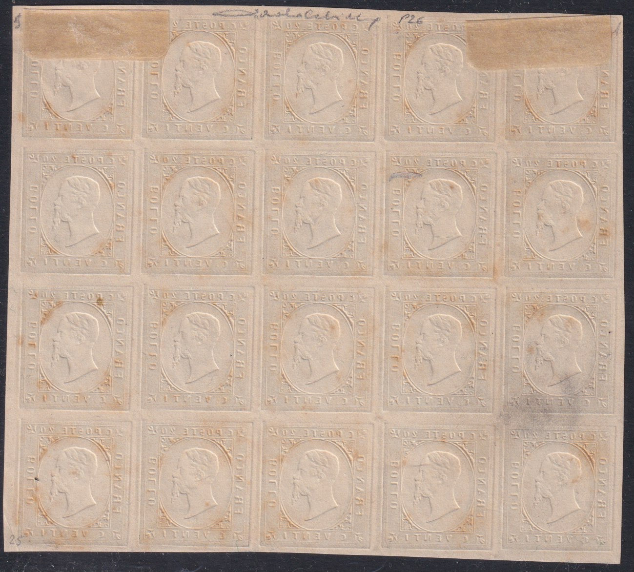 Sard1104 - 1854 - III emissione I composizione prova del c 20 in nero su carta avorio, blocco di 20 esemplari nuovo non gommato (P26)