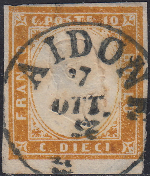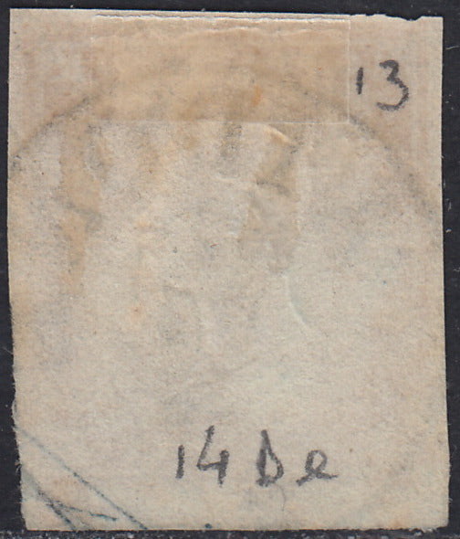 Sard56 - 1861/63 - Annulli Sardo-italiani di Sicilia, c. 10 bruno II tavola + c. 20 indaco violaceo scuro II tavola usati con impronta di ROCCAPALOMBA (14Cp + 15Ea, p.ti 12).