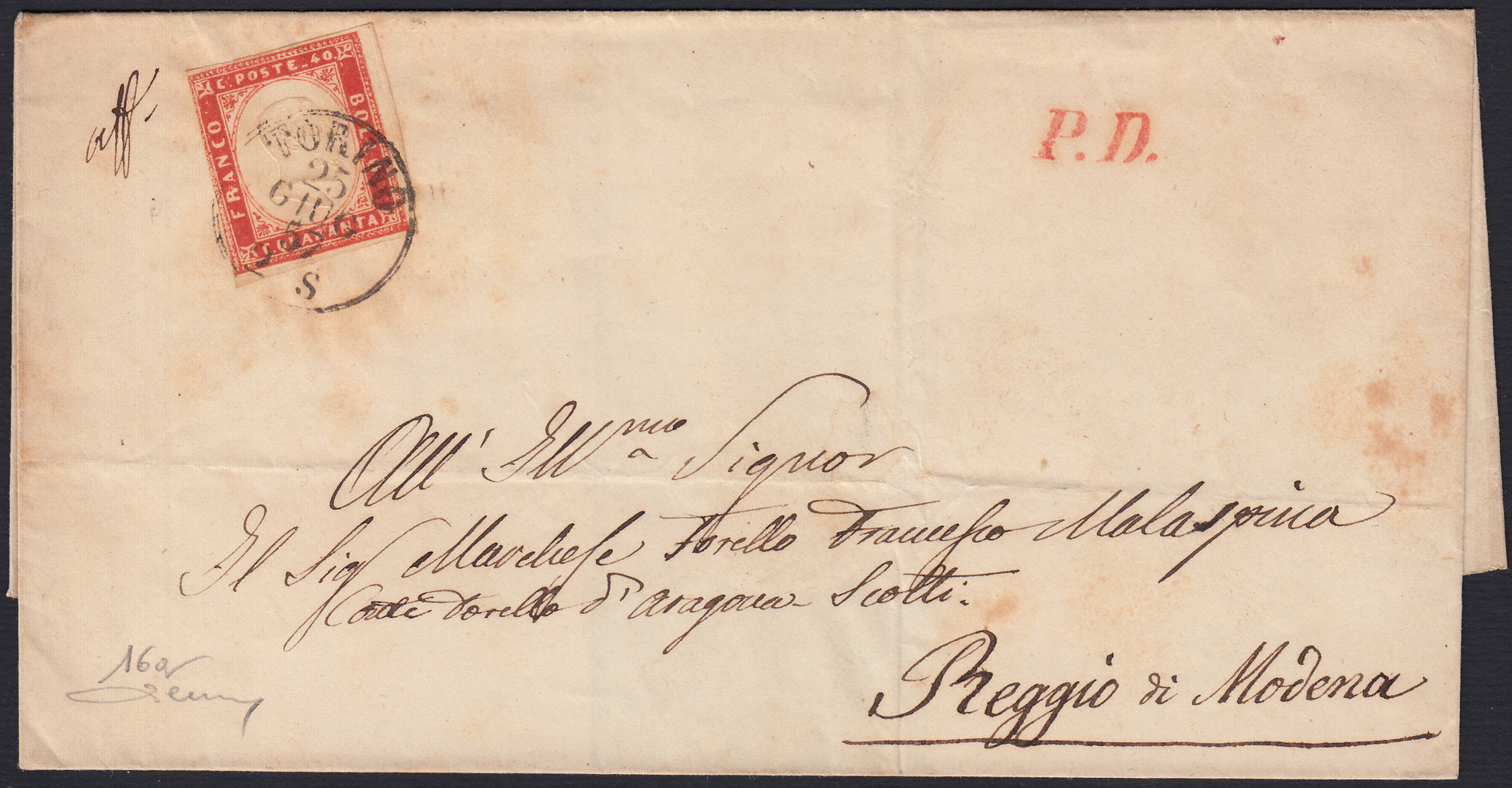 SardSP359- 1857 - IV emissione c. 40 vermiglio I tiratura isolato su lettera da Torino per Reggio di Modena 25/6/57 (16a)