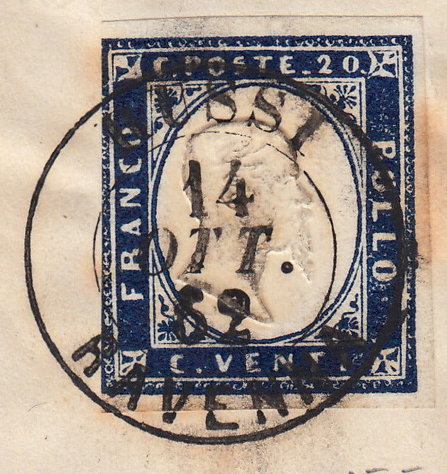1862 - Lettera spedita da Russi (Ravenna) per Terni 14/10/62 affrancata con c. 20 indaco violaceo scuro II tavola