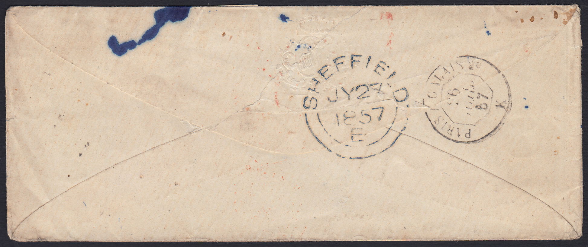SardSP381 - 1857 - Lettera spedita da Genova per Sheffield 23/7/57 affrancata con c. 20 indaco I tavola tre esemplari (15Ab)