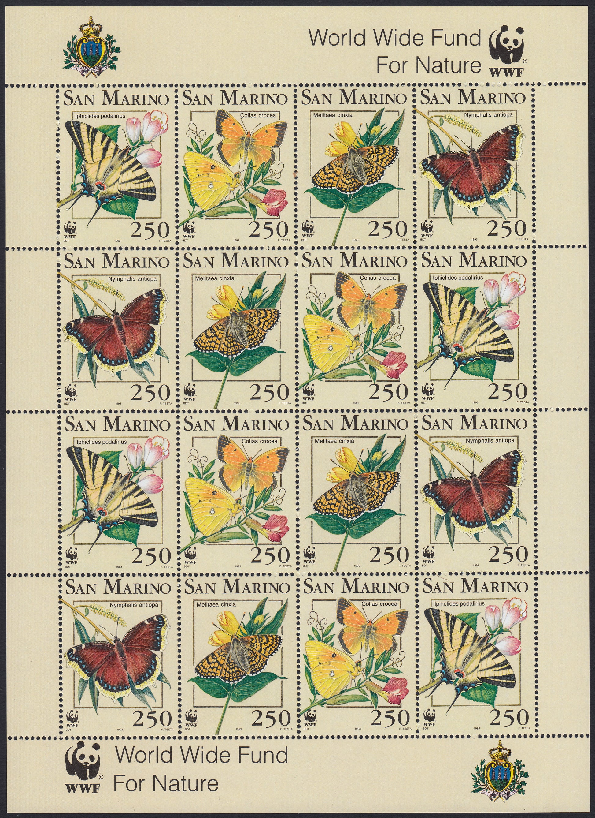 SM107 - 1993 - Animali da proteggere, farfalle, foglietto da 16 esemplari nuovo con gomma integra (1378/1381)
