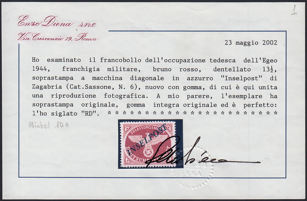1945 - Occupazione tedesca dell'Egeo, francobollo di franchigia militare bruno rosso dentellatura 13 1/4 e soprastampa INSELPOST (emissione di AGRAM) nuovo gomma integra