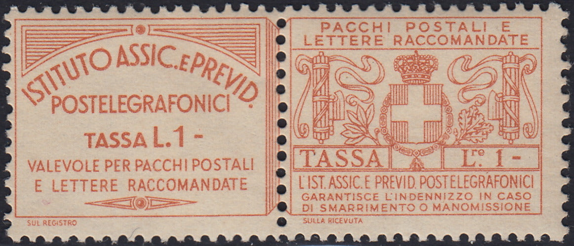 1936 - Francobolli assicurativi e previdenza Postetelegrafonici, L. 1 arancio chiaro nuovo con gomma integra