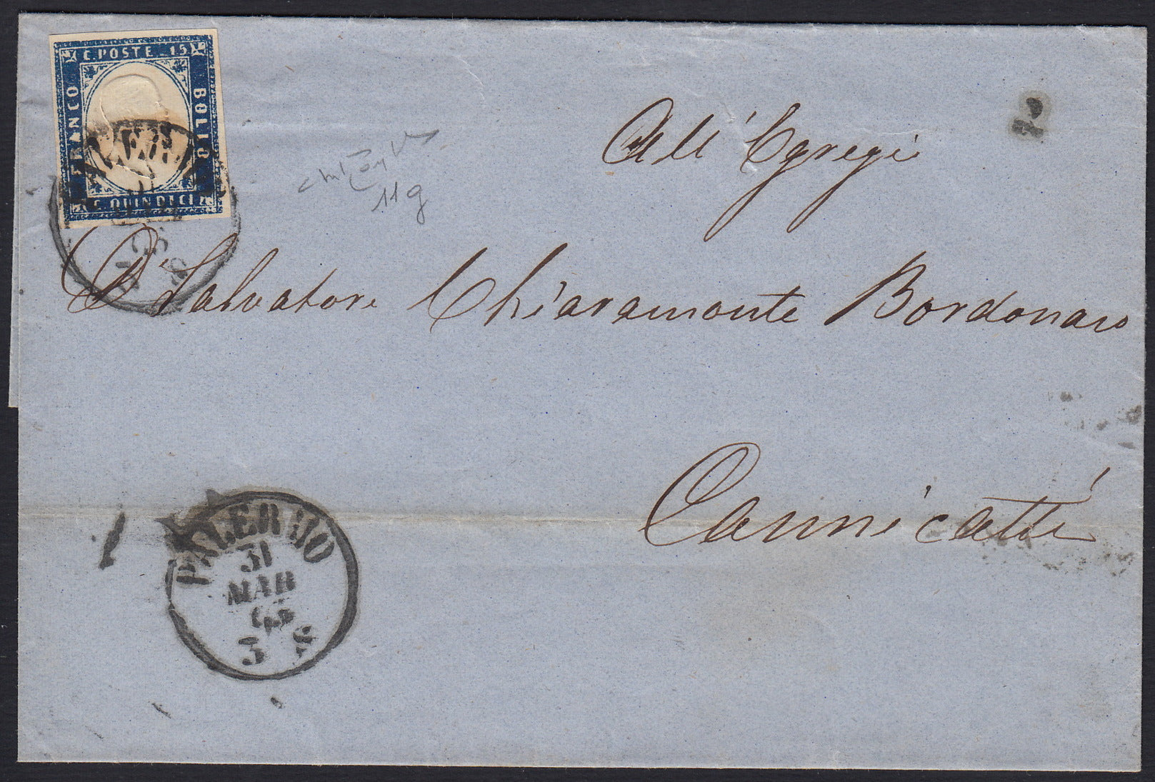 1863 - Lettera spedita da Palermo per Canicattì 31/3/63 affrancata con c. 15 indaco con riflessi violacei