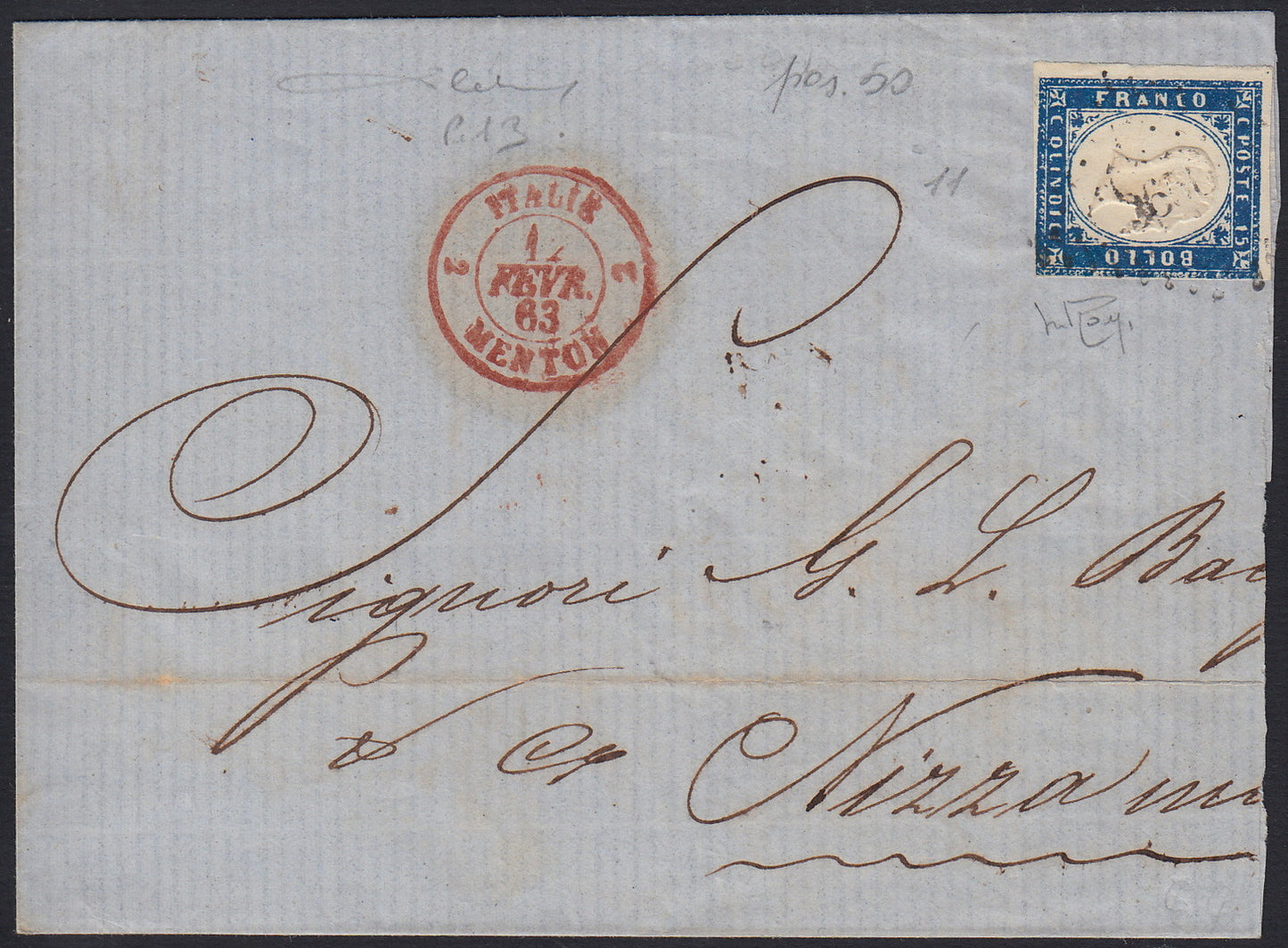 1863 - c. 15 azzurro tipo Sardegna posizione n. 50 usato su gran parte di lettera diretta a Nizza