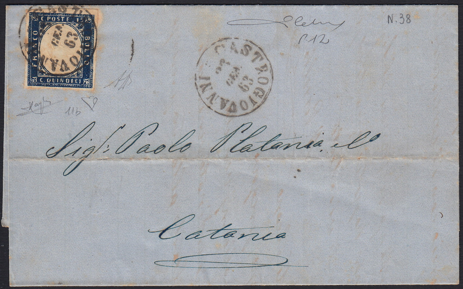 1863 - Lettera spedita da Castrogiovanni per Catania 26/1/63 affrancata con c.15 azzurro scuro tipo Sardegna